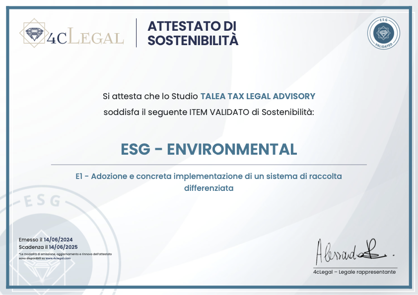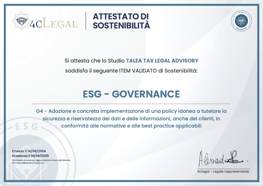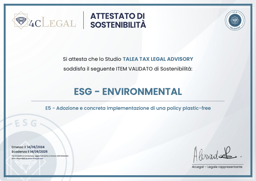 Lo Studio Talea è orgoglioso di annunciare il conseguimento di 12 obiettivi in ambito ESG (Environmental, Social, and Governance) nell'ambito del programma organizzato e certificato da 4C Legal. Questo risultato riflette il nostro impegno concreto verso la sostenibilità ambientale, la responsabilità sociale e la governance etica. Attraverso queste iniziative, ci impegniamo a promuovere pratiche sostenibili, supportare le comunità in cui operiamo e garantire la trasparenza e l'integrità nelle nostre operazioni. Il riconoscimento da parte di 4C Legal conferma la nostra dedizione a integrare i principi ESG nel cuore delle nostre attività professionali.